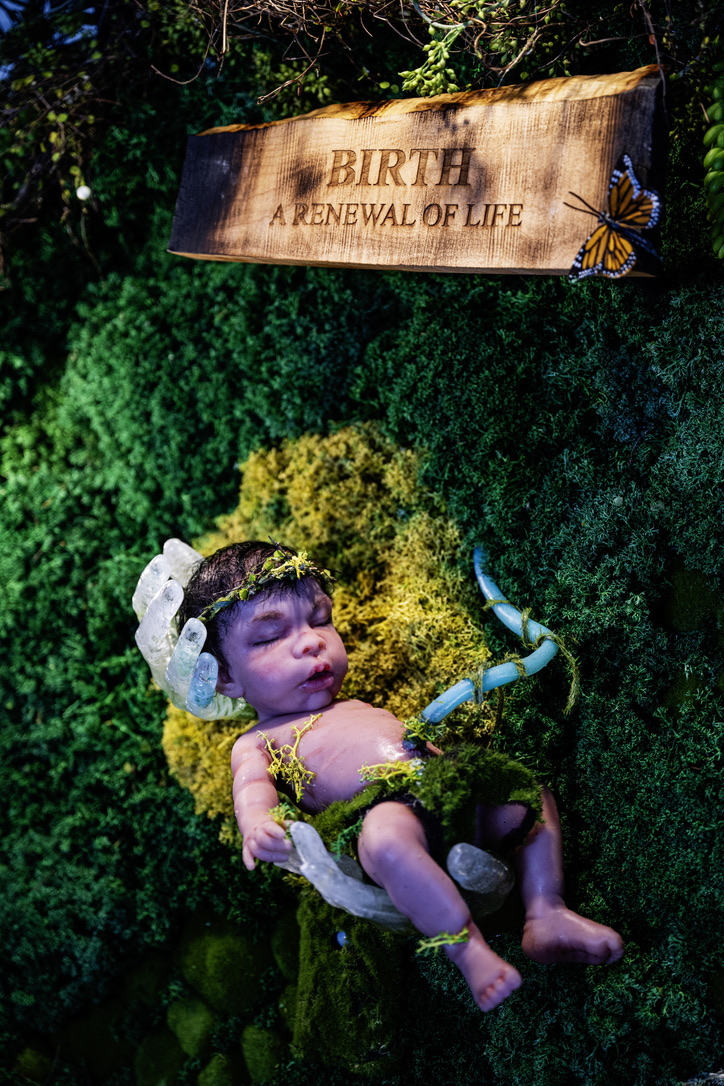 A hand-made full silicon baby (Newborn Artist; Erinfa Art, in Spain) Baby is attached by an umbilical cord to the moss board (for security).
