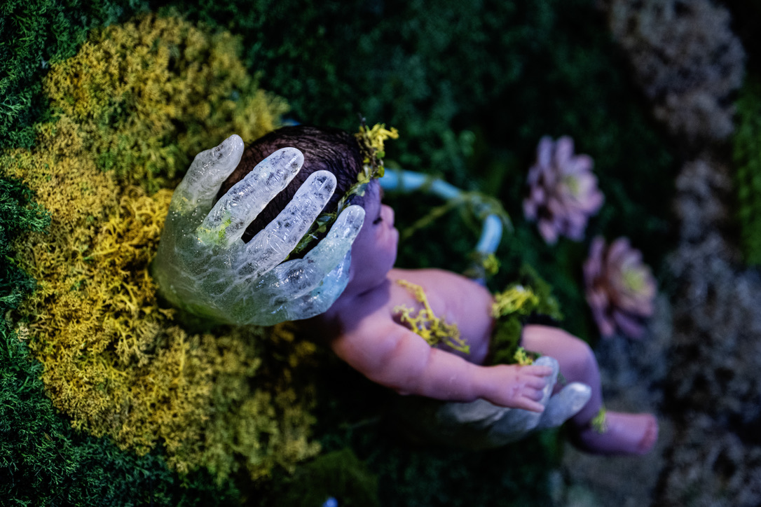This stunning moss art installation, Birth: A Renewal of Life, invites viewers into a lush, green sanctuary where nature cradles new life. Nestled in a verdant nest of vibrant mosses, delicate flowers, and intertwined branches, a newborn baby rests gently in the protective embrace of sculpted hands—symbolizing both human care and Mother Nature’s nurturing touch.